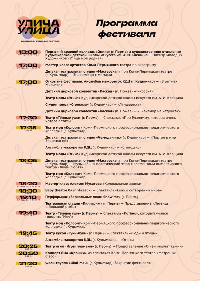 21 июня 2025 года на площади перед Коми-Пермяцким национальным драматическим театром состоится Первый фестиваль уличных театров «Улича-Улица» (0+).
